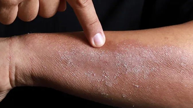 Psoriasis is a skin condition that causes flaky patches of skin which form scales. On brown, black, and white skin the patches can look pink or red, and the scales white or silvery. On brown and black skin, the patches can also look purple or dark brown, and the scales may look grey. These patches normally appear on your elbows, knees, scalp, and lower back, but can appear anywhere on your body. The severity of psoriasis varies greatly from person to person. For some it's just a minor irritation, but for others it can have a big impact on their lives.
