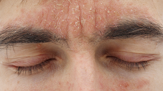 Seborrheic dermatitis is a common skin condition that mainly affects your scalp. It causes scaly patches, inflamed skin, and stubborn dandruff. It usually affects oily areas of the body, such as the face, sides of the nose, eyebrows, ears, eyelids, and chest. This condition can be irritating but it's not contagious, and it doesn't cause permanent hair loss. Seborrheic dermatitis signs and symptoms may include Flaking skin (dandruff) on your scalp, hair, eyebrows, beard or mustache, Patches of greasy skin covered with flaky white or yellow scales or crust on the scalp, face, sides of the nose, eyebrows, ears, eyelids, chest, armpits, groin area or under the breasts, Rash that may look darker or lighter in people with brown or Black skin and redder in those with white skin, Ring-shaped (annular) rash, for a type called petaloid seborrheic dermatitis, Itchiness (pruritus)